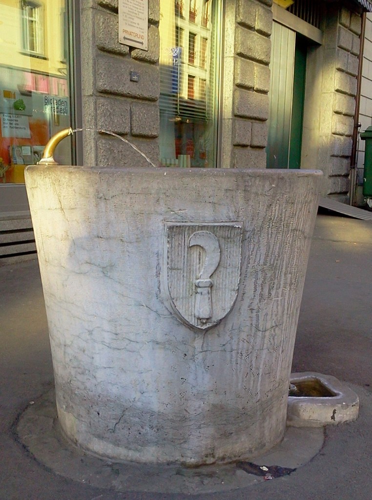 The one in the corner of Seefeldstrasse and Kreuzstrasse. It looks like any other Zunft [Guild] fountain, but it is actually my local fountain. Behind it, Bioladen Paradiesli, an organic/bio grocery shop with products from local farmers. The sickle is the shield of the neighborhood Riesbach Zunft.