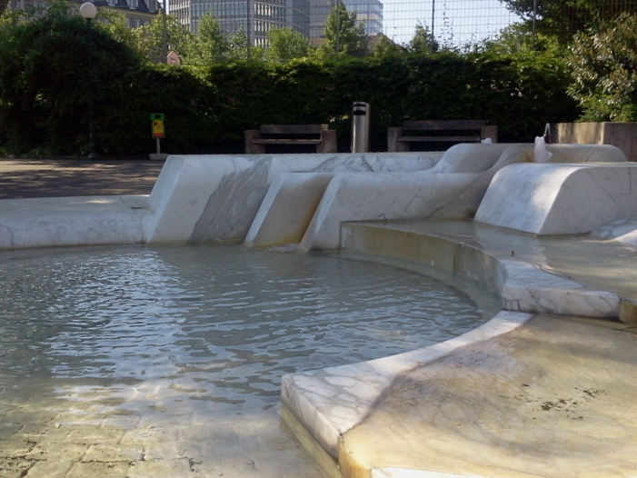 It is a bit off the beaten track in a small park informally known as the Bärenplätzli [the small-bears square], right in front of a small pedestrian path that crosses the Limmat. It is the work of Demetrios Yannakopoulos, who envisioned it as being a place of peace and retreat in the middle of the busy city. And indeed it is an a place of tranquility… Most people had gone on vacations when the picture was taken, but in a nice sunny day, this place would have children playing, people sitting around and bankers having a break.