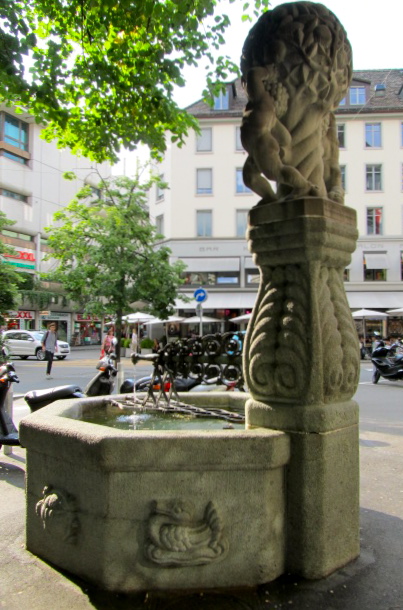 This fountain is normally hidden by bikes and cars and it took a very tuned ear to find it. But, when you sit at the very popular Hiltl open air area, you can easily spot it.