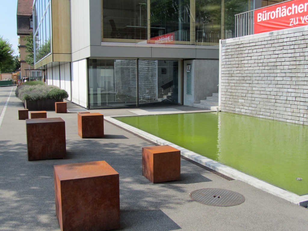 The one almost at the end of Seefeldstrasse, at the entry an office complex. Technically, it is a pond. But, it is water contained in a basin and the water has some kind of movement and tiny waves. So, there must be a water jet somewhere… Although there is no warning sign it is probably, another kein Trinkwasser [no drinking water] fountain.