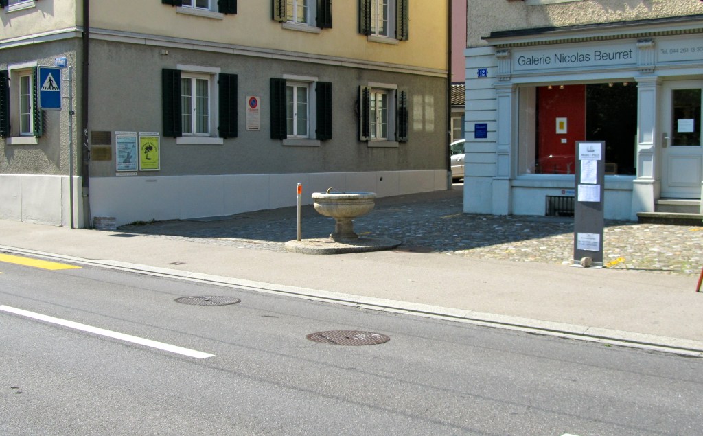 The one in Zeltweg, right between the Piccola Commedia dell’Arte and Gallerie Nicolas Beurret. Probably, there must be a very good explanation for it, but as it is, it seems thd fountain was randomly dropped in the middle of a small private alley, a (double) sidewalk and the road. For an extra dramatic effect, a guiding fluorescent pole was stick to ground. Clearly, not a good way to go about it, as the pole is now bent over backwards. Not the sort of botched job engineering you expect to find in Switzerland.