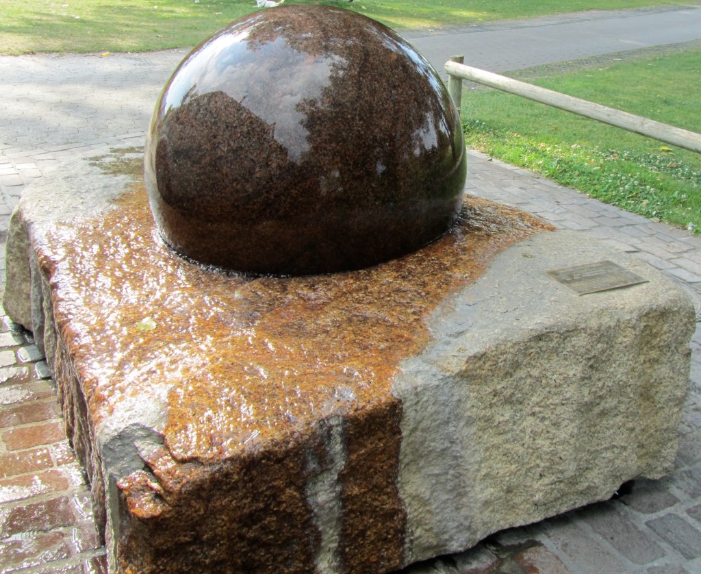 Better known as the Kugelbrunnen [ball fountain], it is in the Zürichhorn. This park and recreational area on the East side of Lake Zurich is very popular and can get horribly busy in hot Summer days (and Sundays) like today. The Kugelbrunnen was originally created for the Phenomena Exhibition of 1984 and left here as a reminder. The 1000-Kg granite sphere can be moved with relative ease thanks to the flow of 5-L of water per second coming from underneath (if you must know, fluid dynamics explains it). In any case, it is always fun to play with it…