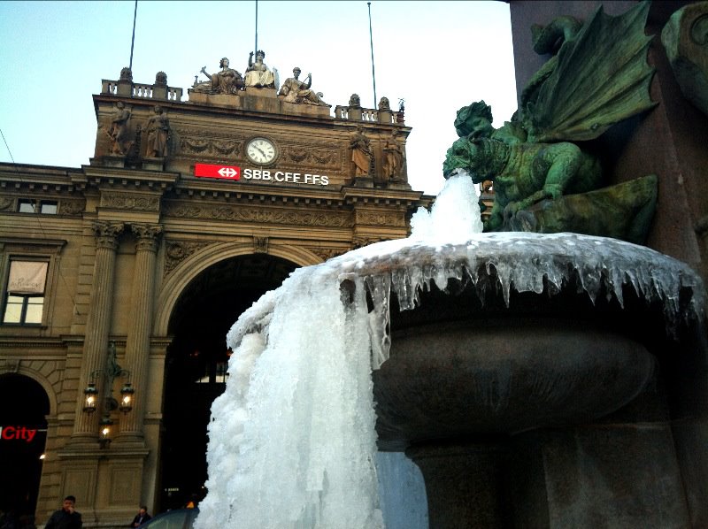 It was fountain number 60, the one presiding over the Banhnofstrasse. You have seen in the peak of Summer and covered in snow. But, today Frau T. found another angle to this fountain on her way to the Hauptbanhnof. It is at least curious to see a dragon spitting ice… It is still bitterly cold in Zurich. Slowly but surely, all fountains are starting to have more ice than flowing water.