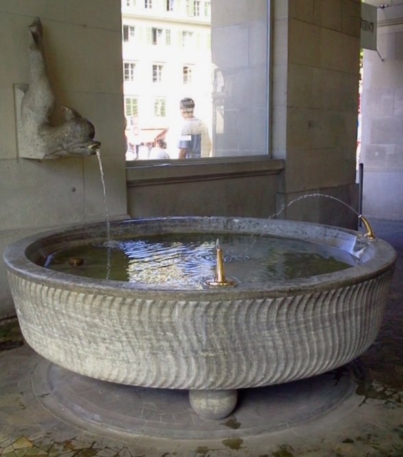 The one in the entrance of Helmaus, an annex building of the Wasserkirche. If you remember fountain number 76, the one in Lindenhofstrasse, you might also remember Felix, Regula and Exuperantius, the patron saints of Zürich, who after being decapitated, miraculously stood to their feet, picked up their own heads, walked forty steps uphill to finally lay down dead. It was in a crypt of the Wasserkirche, built on a small island in the Limmat, where the execution took place. The Helmaus, first built to serve as a court of criminal justice, is today home to a consortium of local artists, who regularly show their pieces.