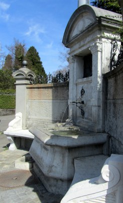 The one at the entrance of the Rehalp cemetery, in the cross of Forch- and Enzenbühlstrasse. It is used to be in cross of Bleicherweg and Stockerstrasse, in the city center and was moved here in 1911 by popular request. It seemed to have been a happy coincidence – the fountain would no longer fit the new traffic plans, the local neighbors were asking for one and the city of Zurich wanted to add more elements to it. And, the fountain has been happily siting in this place for a century. Another trivia – the two benches are a made of Jurassic limestone and its arms the Zurich coat of arms. There are no reports of ghosts or other paranormal phenomena, nor I was able to find records of any celebrities being buried here. It is actually a quite a nice place to finish your days, overlooking the Zurich lake, the Zuriberg and the cemetery’s gardens.