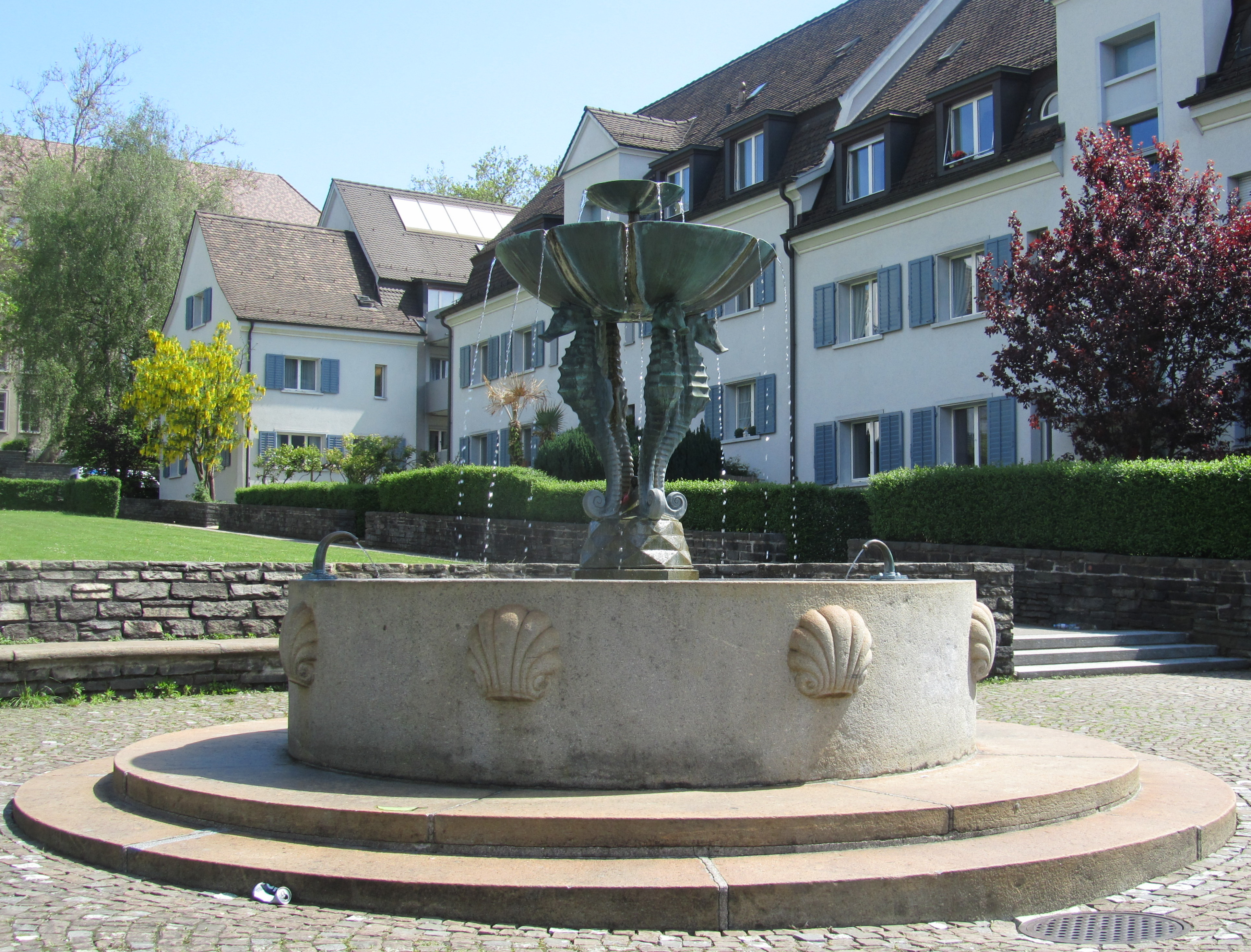 The one in the Im Hofgarten, in a very residential neighborhood overlooking the Zurich Lake and the Uetliberg. In case you ever wondered where tram 15 ends – it is very close to this fountain.