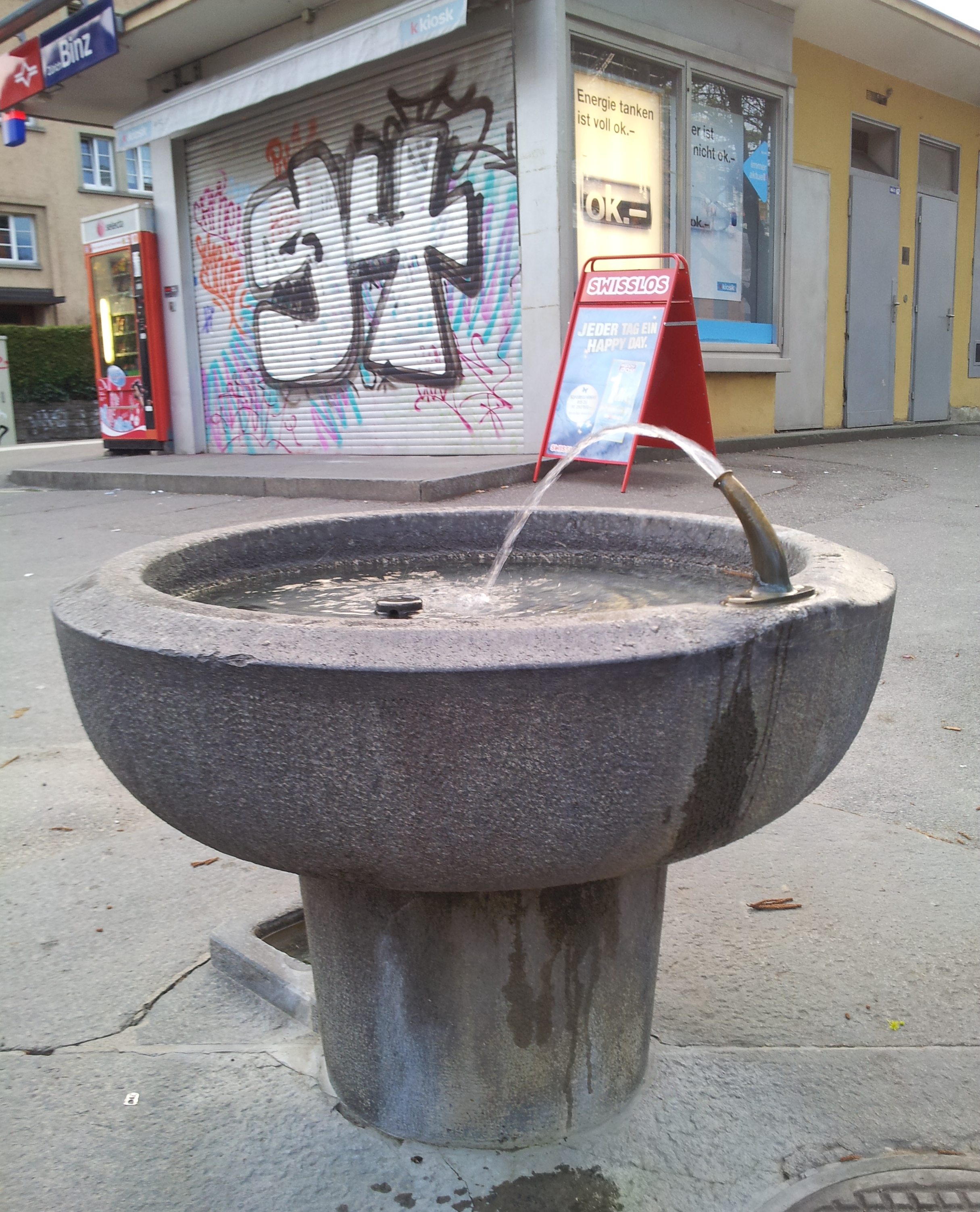 The one in Binz train station, on the way to the Uetliberg. It looks like any other regular granite drinking fountain in fast growing residential neighborhood, but I walk in front of it every Thursday on my way to yoga class. Never a happy moment without a fountain to remind me about it…