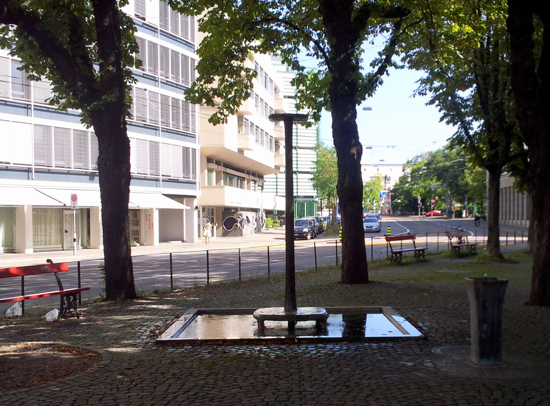 The one in Werd Platz, in a quiet little park in the middle of the busy City district. It has the doubtful honour of being one of the least successful fountains in Zurich. Is the drinking fountain a part of this installation? Was it meant as a homage to shower? Many unsolved questions – though I have to admit the drinking fountain has come in handy a few times.